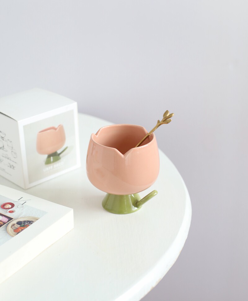 艺德小屋送勺 ins风设计感十足的粉色陶瓷郁金香马克杯甜品碗热门设计联盟服务商
